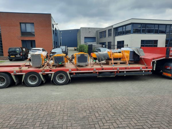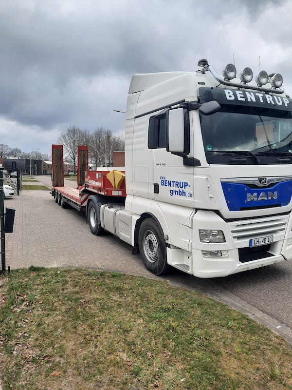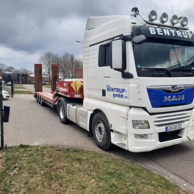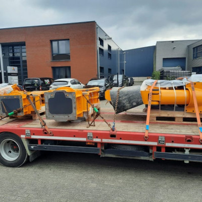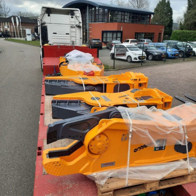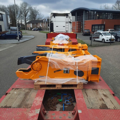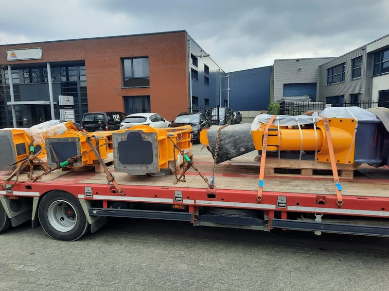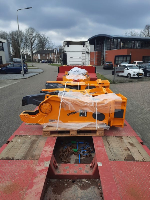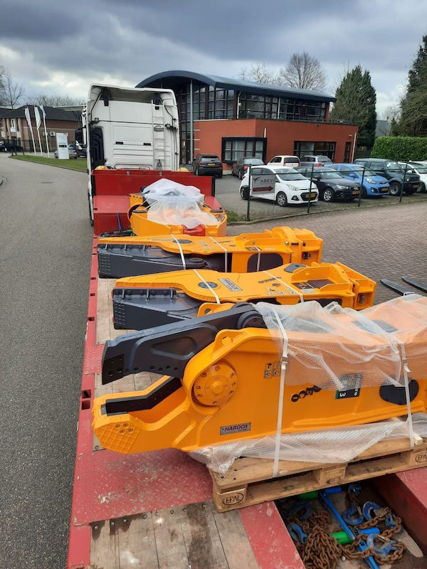 Große Lieferung für die neue Bentrup-Niederlassung in Bad Bentheim: Gut verpackt kamen nun verschiedene Bagger-Anbaugeräte wie Stahlscheren und Abbruchwerkzeuge vor Ort und können ab sofort in den Verkauf und die Vermietung gehen.